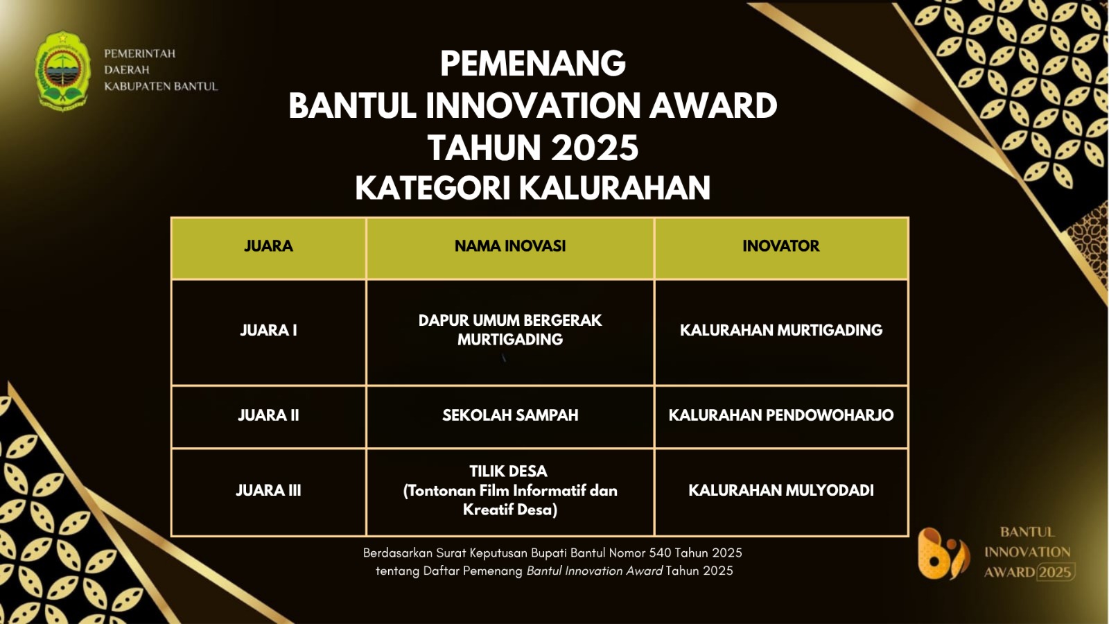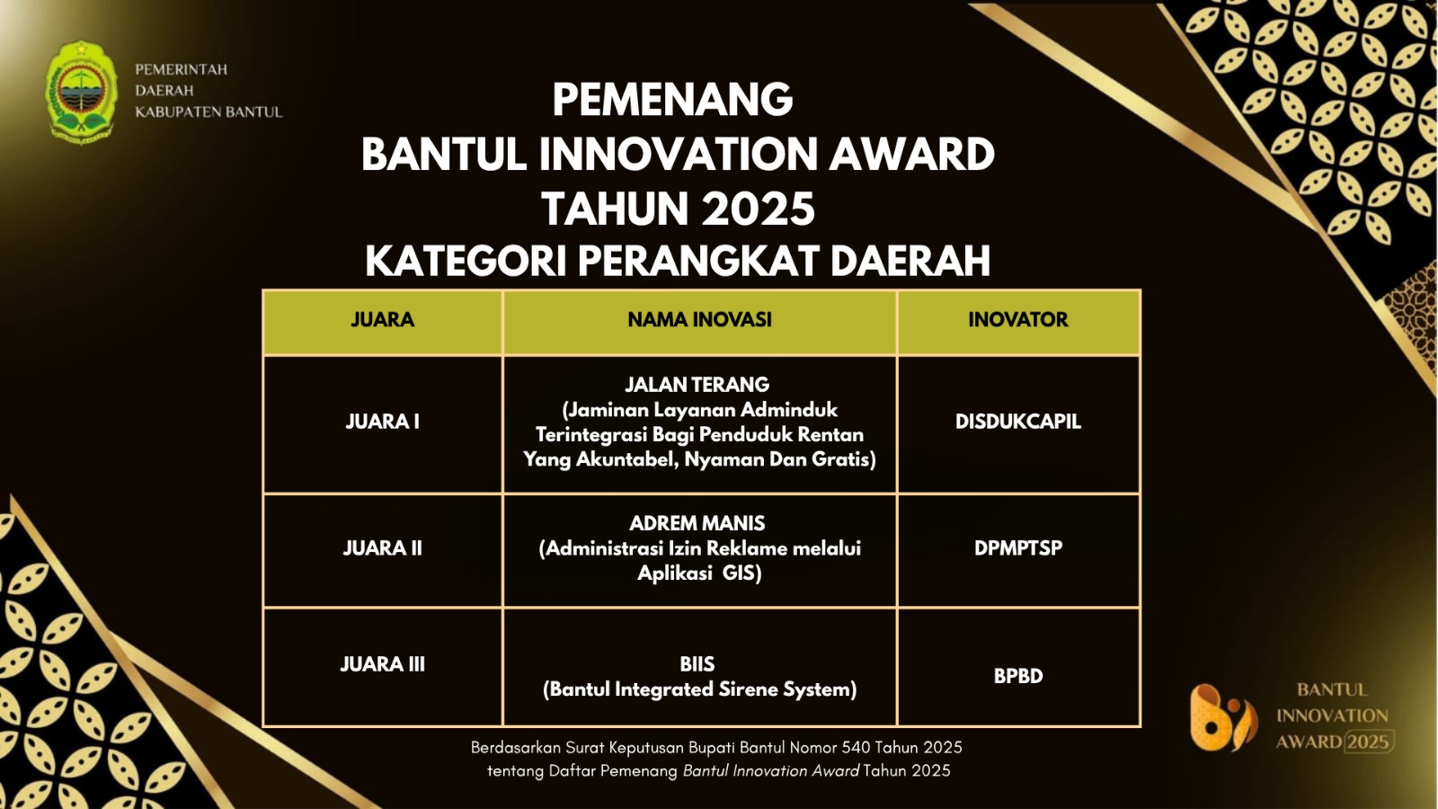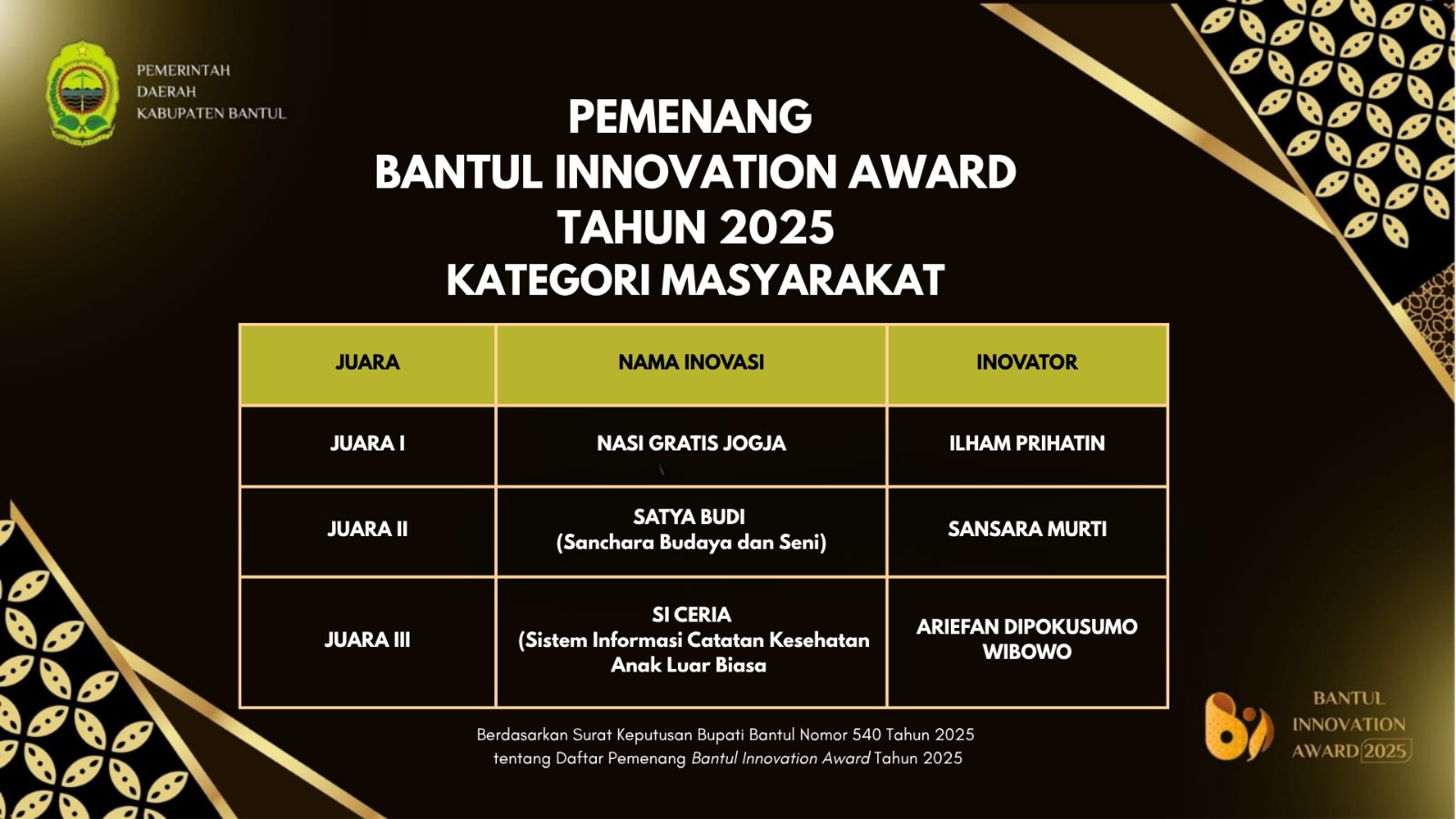 Untuk membangun ekosistem Inovasi, Pemerintah Kabupaten Bantul telah menyelenggarakan Bantul Innovation Award (BINA) Tahun 2025 pada hari Selasa (23/09) di Waroeng Omah Sawah. Acara ini sebagai ajang bagi instansi di lingkungan Pemerintah Kabupaten Bantul dan masyarakat untuk menciptakan inovasi yang memiliki aspek kemanfaatan bagi Kabupaten Bantul. Bantul Innovation Award dilaksanakan setiap tahun dan tahun 2025 ini merupakan tahun ketiga. BINA juga berfungsi sebagai sarana persiapan untuk mengikuti Innovative Government Award yang diselenggarakan oleh Kementerian Dalam Negeri Republik Indonesia.