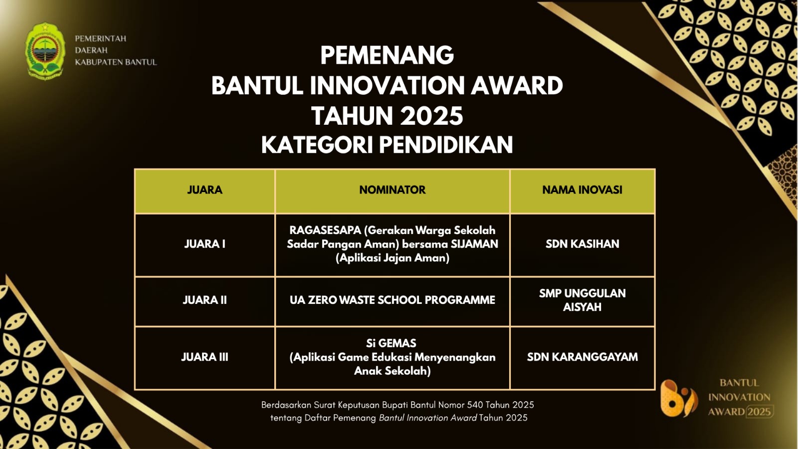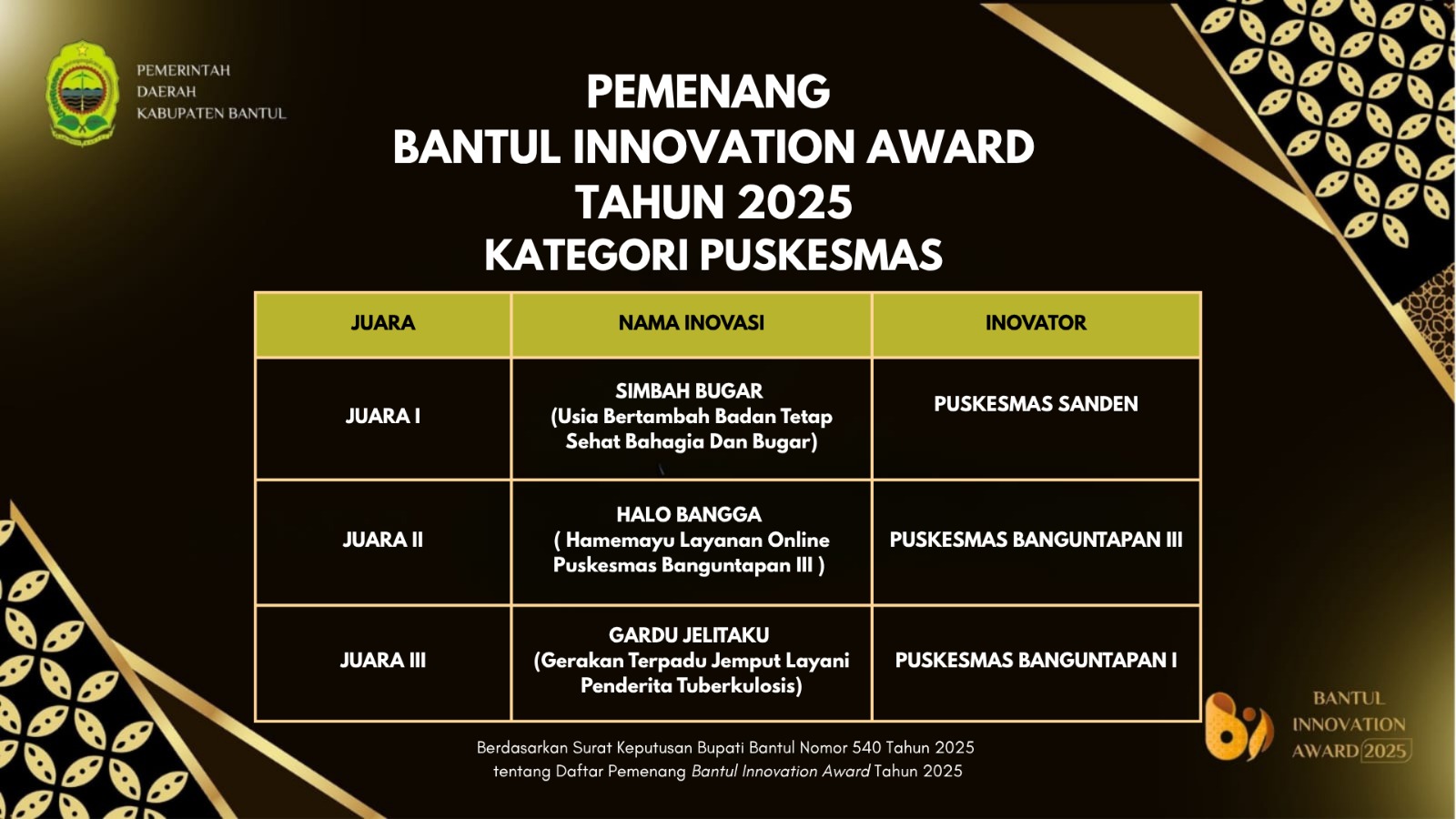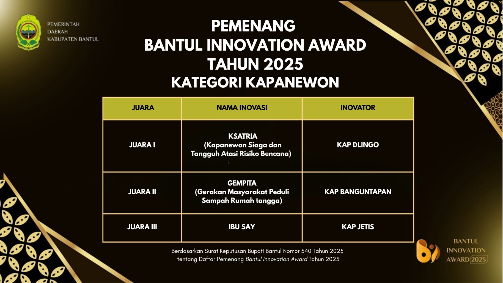 Untuk membangun ekosistem Inovasi, Pemerintah Kabupaten Bantul telah menyelenggarakan Bantul Innovation Award (BINA) Tahun 2025 pada hari Selasa (23/09) di Waroeng Omah Sawah. Acara ini sebagai ajang bagi instansi di lingkungan Pemerintah Kabupaten Bantul dan masyarakat untuk menciptakan inovasi yang memiliki aspek kemanfaatan bagi Kabupaten Bantul. Bantul Innovation Award dilaksanakan setiap tahun dan tahun 2025 ini merupakan tahun ketiga. BINA juga berfungsi sebagai sarana persiapan untuk mengikuti Innovative Government Award yang diselenggarakan oleh Kementerian Dalam Negeri Republik Indonesia.